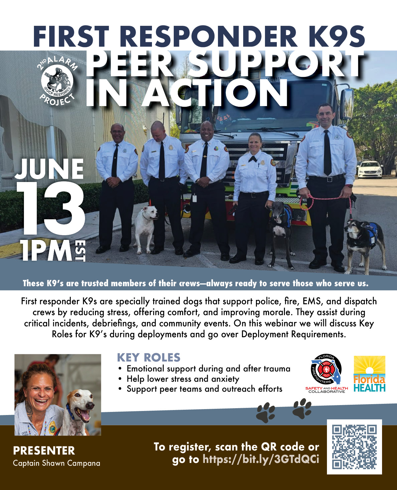 Description: First responder K9s are specially trained dogs that support police, fire, EMS, and dispatch crews by reducing stress, offering comfort, and improving morale. They assist during critical incidents, debriefings, and community events. On this webinar we will discuss Key Roles for K9’s during deployments and go over Deployment Requirements.