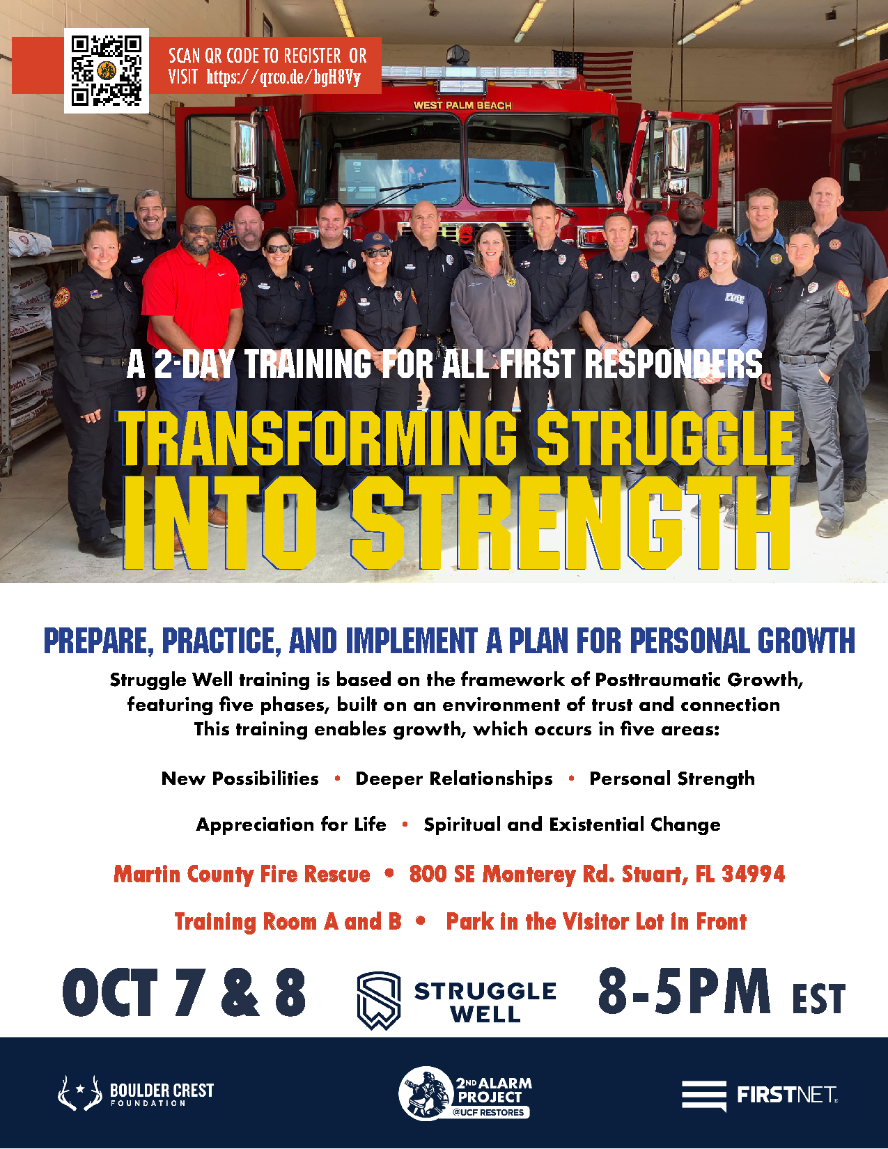 2nd Alarm Project is presenting Struggle Well in partnership with the Boulder Crest Foundation. In this 2-day course, the participants will gain an in-depth understanding of the Struggle Well philosophy, and the practices and principles of Posttraumatic Growth.