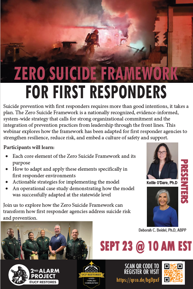 Webinar Description : Suicide prevention with first responders requires more than good intentions, it takes a plan. The Zero Suicide Framework is a nationally recognized, evidence-informed, system-wide strategy that calls for strong organizational commitment and the integration of prevention practices from leadership through the front lines. This webinar explores how the framework has been adapted… for first responder agencies to strengthen resilience, reduce risk, and embed a culture of safety and support.
